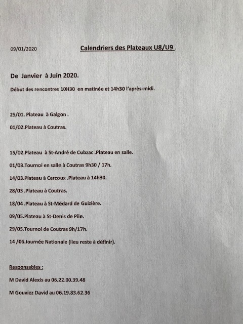 Calendrier U8/U9 janvier à Juin 2020