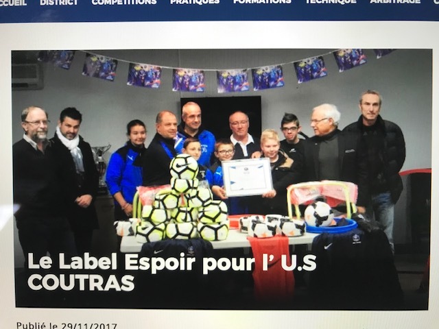 Mardi 28 novembre à 18h30, se déroulait la remise du Label Espoir au club de l’US COUTRAS. Dans le club house du stade municipal AUDEBEAU, Jean Michel TRELY, Président du club, accueillait une belle assemblée.