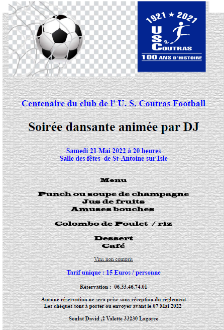 A l'occasion du centnaire du club , une soirée dansante est organisée le Samedi 21 Mai dans la salle des fêtes de St-Antoine/ Isle .